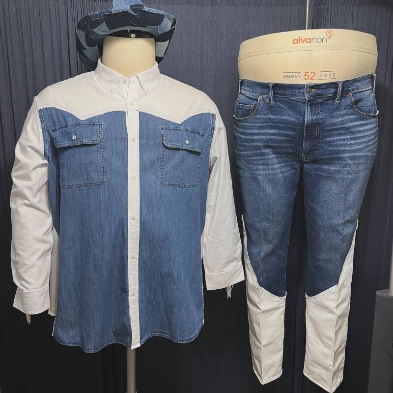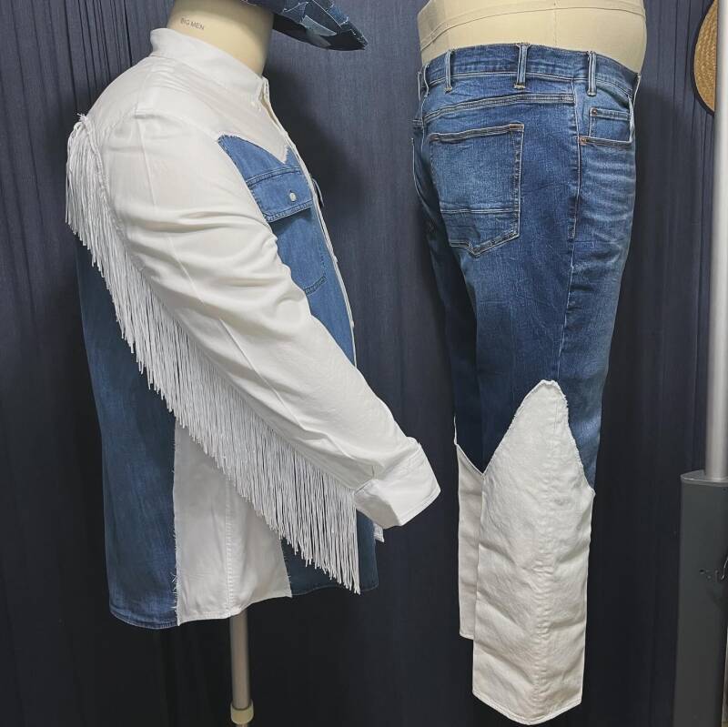 The final look includes a color-blocked denim shirt with contrast yoke, pearl snap pockets, and one of my favorite elements—dramatic fringe across the back and sleeves. The matching jeans feature coordinated paneling that ties the outfit together, creating a cohesive western aesthetic with a modern edge.